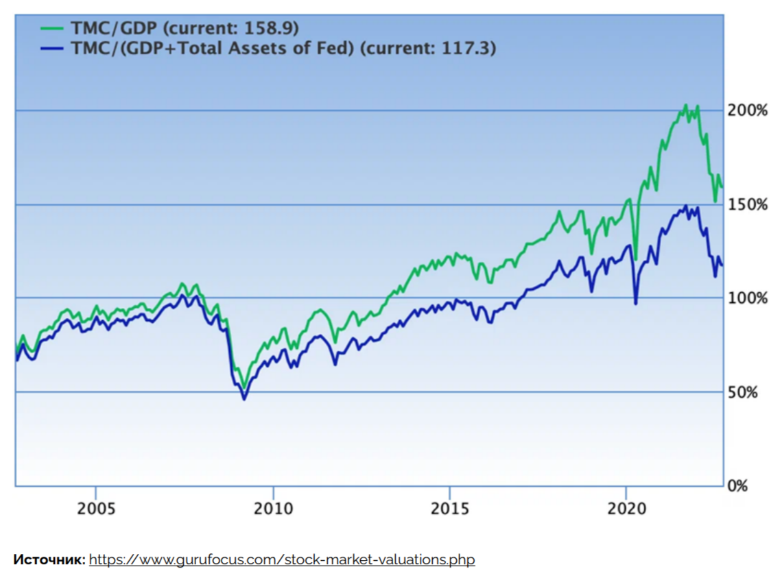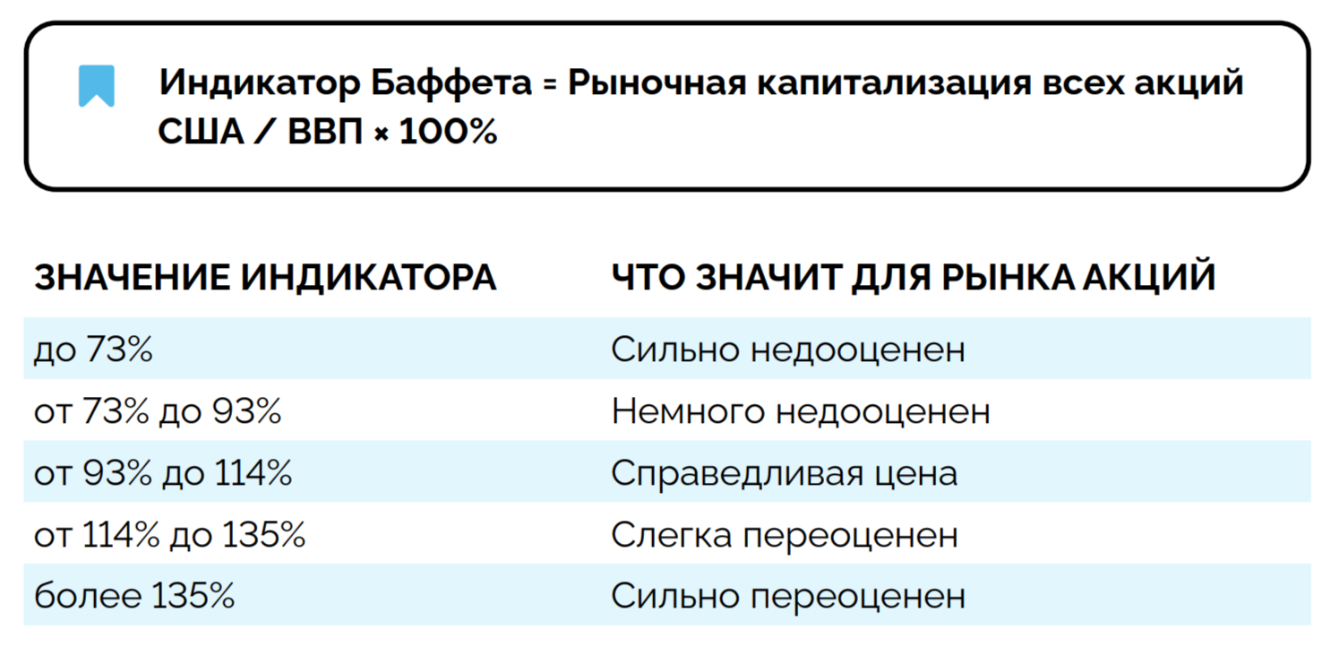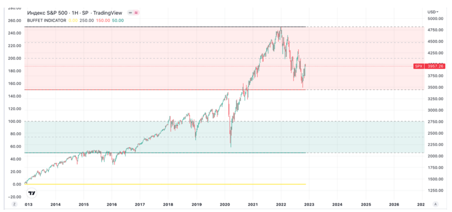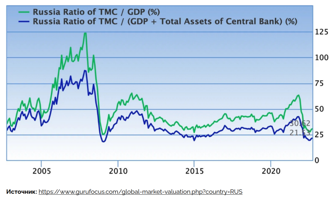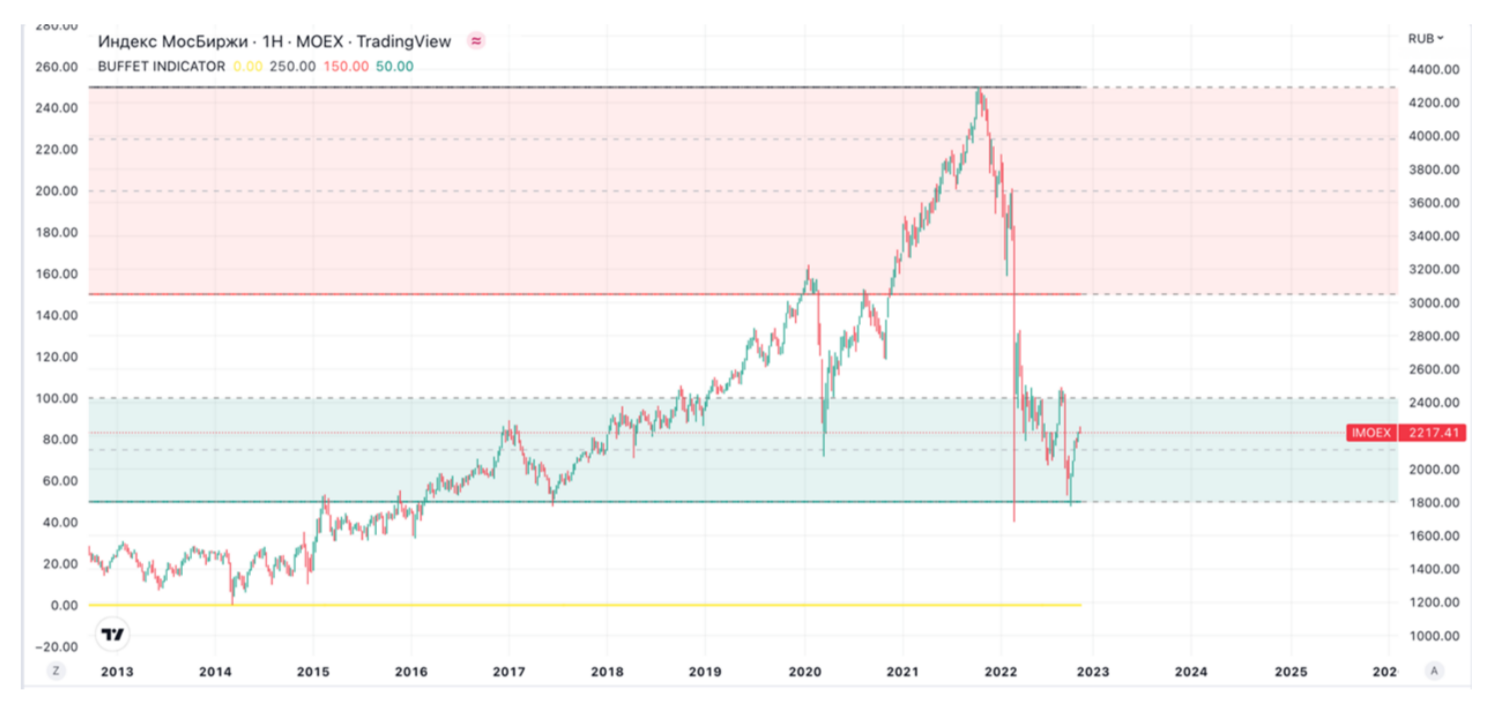 На TradingView индикатор Баффета показывает, что индекс Московской биржи в зелёной зоне: в районе 50 %. Получается, что российский рынок сильно недооценён. А это значит, что рынок высокорискованный — но и премия за риск выше.
