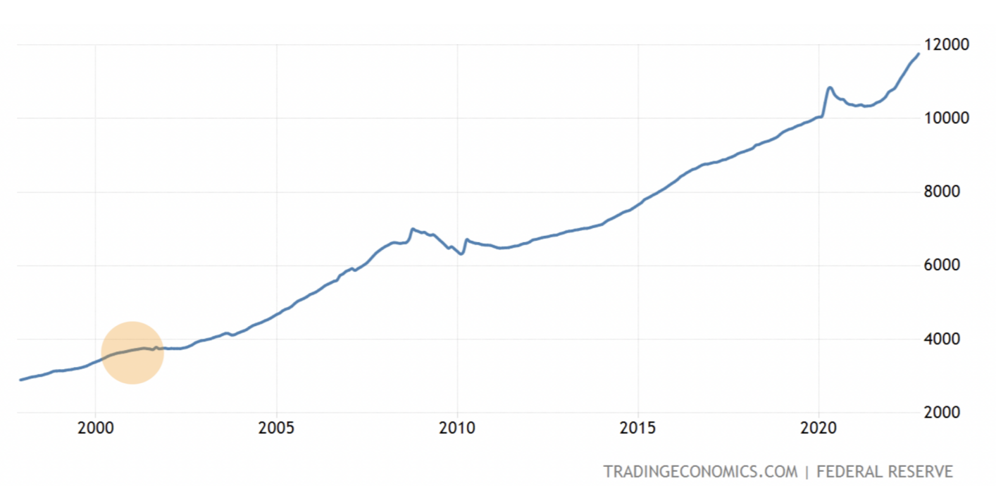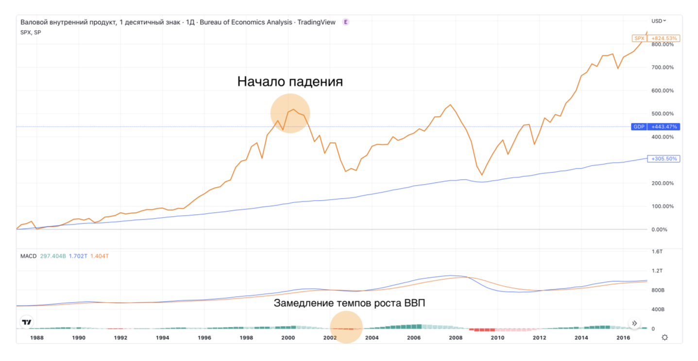 И тем не менее рынок начал коррекцию именно в 2000-м году. Почему так? Дело в том, что рынок живёт ожиданиями и ожидания, как правило, закладывают предстоящую динамику рынка. Поэтому коррекция началась ещё в 2000-м, хотя экономика ещё продолжала расти. Но в стоимости акций этот потенциал роста уже был учтён ранее.