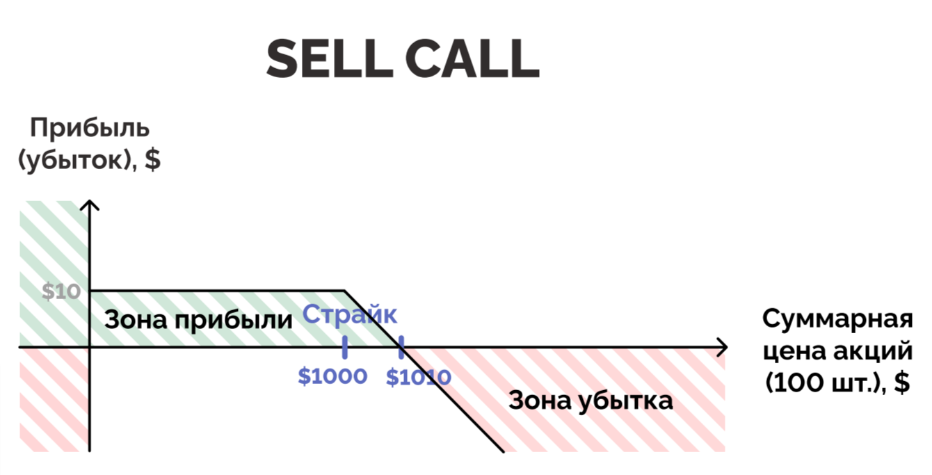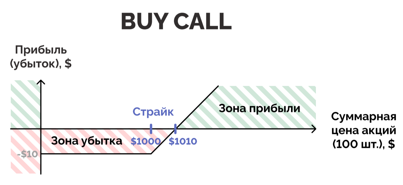 По условиям опциона, если цена акции будет выше цены страйка(>10$), то я куплю акции по цене страйка, то есть по 10$. За такую возможность я плачу премию, например 0.1$ на акцию. За 100 акций, то есть за весь опцион я заплачу 10$ премии. Если мои ожидания оправдались и цена акции равна 15$, то я могу купить акции по 10$ и получить прибыль 5$ на одну акцию. Прибыль получается потому, что на рынке акция стоит 15$, но я ее купила по 10$. Я могу ее продать и получить прибыль. Суммарная прибыль с опциона получится 500$ минус премия, то есть 490$.