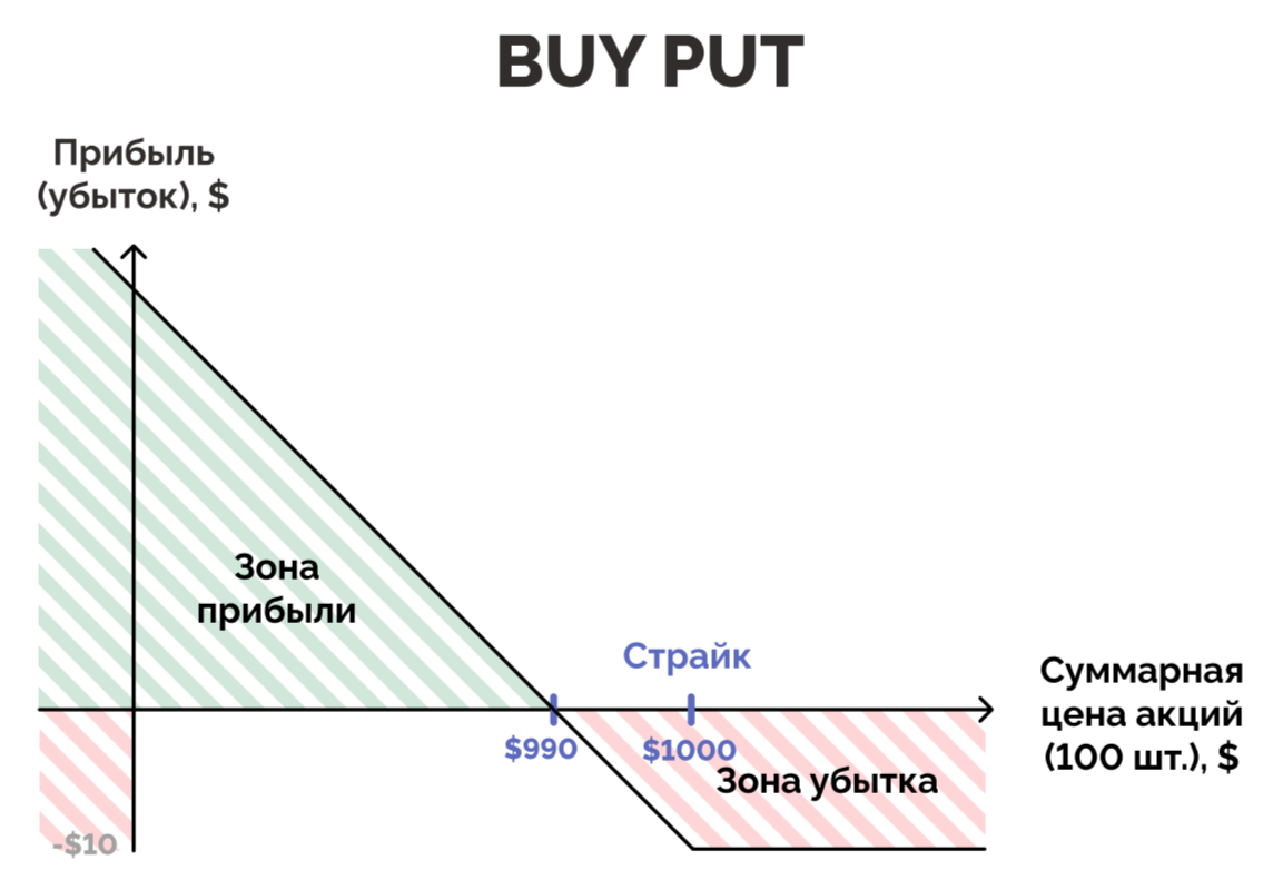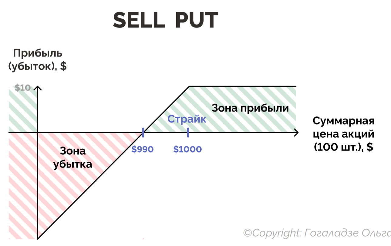 В данном случае цена сделки 800$, прибыль при оправдании ожиданий 700$, убыток при цене акции 5$ – 300$, максимально возможный убыток – 800$.
